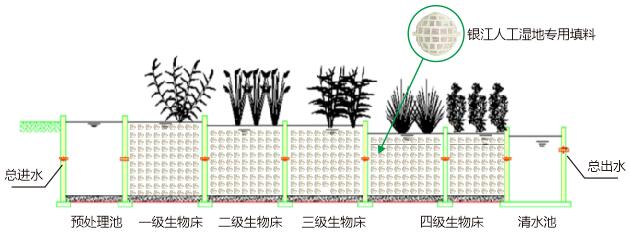 人工濕地是目前國內外應用最廣的水體凈化技術,銀江環保主推WJS景觀濕地處理工藝。其特點是:出水水質好、占地小、無堵塞、運行費用低、工程壽命長、具有園林景觀效果。該技術曾先后獲得國家科技進步獎和環保部科技獎,成果達到國際領先水平。利用水系岸邊空地建立生態濕地公園,美化環境的同時對水體進行治理。