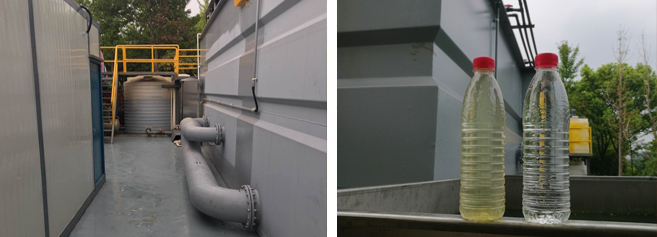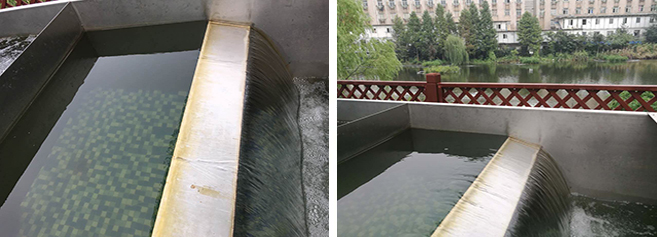十號河位于杭州市江干區,北起余杭區界,向南流入和睦港,全長1762米,河面寬度5-100米,平均水深約2.3米,河道水體容量約10萬立方。2015年,該河道已進行了生態治理和養護工程,目前河道水體中藻類較多,水質總磷超標,屬于劣五類水,且水體顏色呈“棕綠色”,水面有大量的水綿等漂浮物,嚴重影響河道的生態景觀效果。 該項目采用了一套5000噸/天的KtLM濾膜一體機進行河道水質提升,出水達到Ⅳ類水標準。