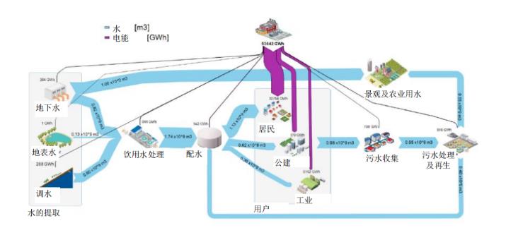 圖2所示給出了北京2015年水系統水量與能耗分配關系?;鶊D,可以評估城市“水足跡”過程及能量消耗,在城市尺度上系統評估和多目標優化“水-能”關系,通過水系統全流程過程系統規劃、聚焦水循環每個鏈條,進行傳統工藝改進、高效設備及革新性工藝技術應用,尤其是對排水系統結構優化進而提升系統能源利用效率,因地制宜地采用污水中資源、能量回收以及清潔能源提取和利用等技術措施,進一步降低水系統能耗和溫室氣體排放,對于提升水系統韌性及可持續至關重要。